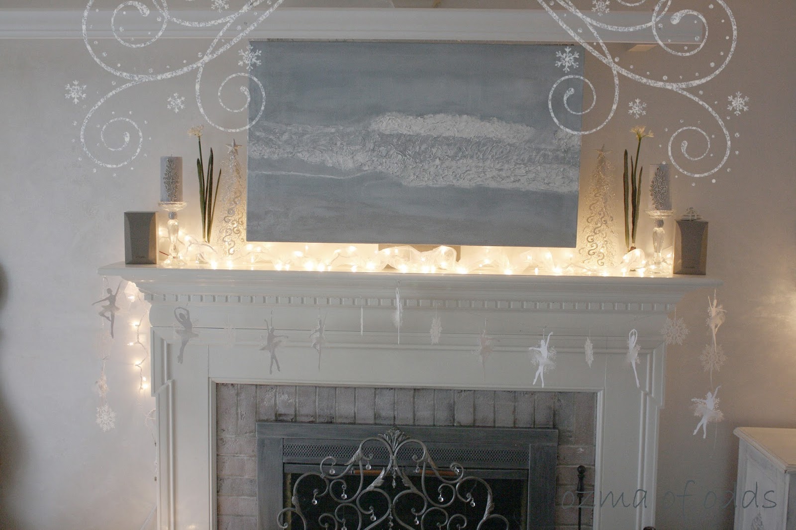 our mantle complete with a garland of snowflakes and paper snow angels...